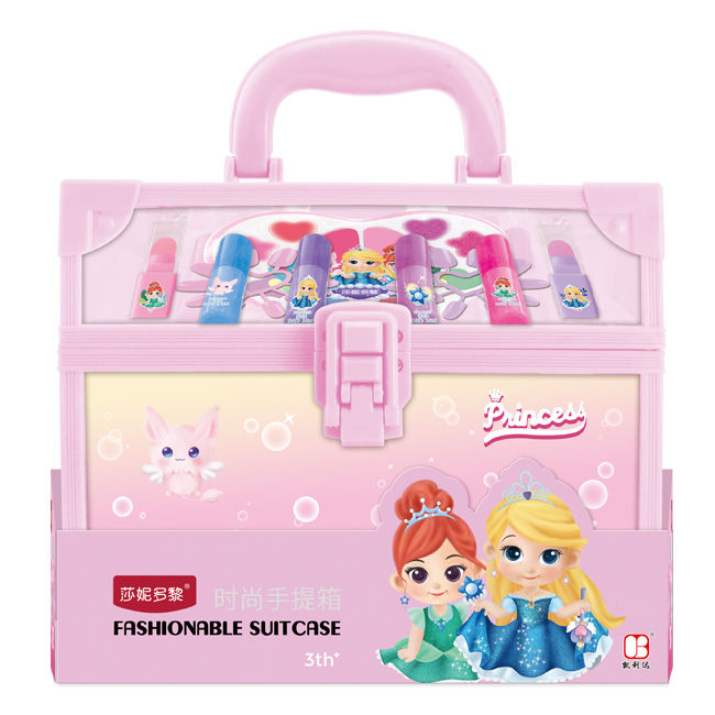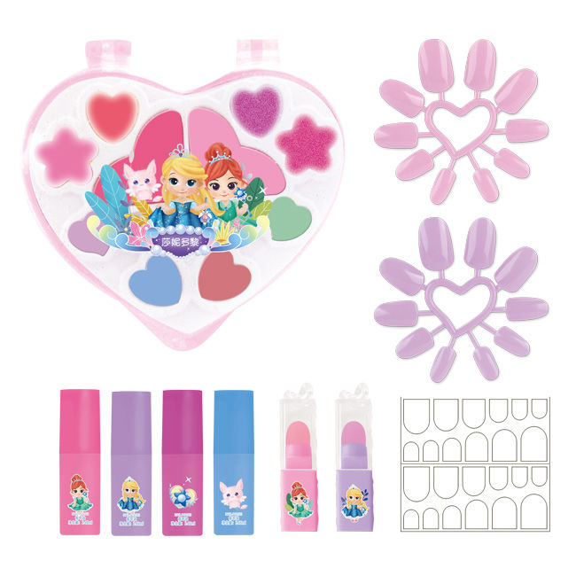 2只唇彩,2只闪粉唇彩,2只腮红膏,4只眼影膏,2只指甲圈,4只指甲油,2只口红,24粒双面胶